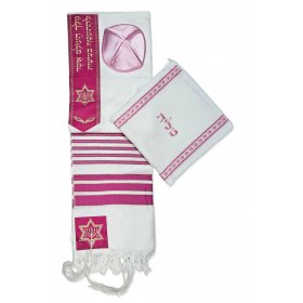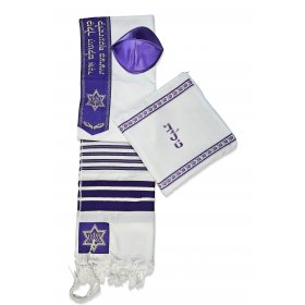 In our collection of over one hundred and fifty tallitot you will find wool, silk, terylene, organza or combinations. There are exclusive tallitot with dignified stripe designs or dramatic styles in bright pastel color shades. There is a huge variety of decorative Judaic themes - Jerusalem images, Stars of David, the Seven Chosen Fruits or lively pomegranate themes.