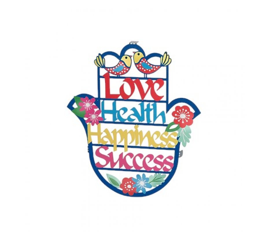 Bring a smile to someone dear to you with this cheerful Dorit Judaica Hamsa standing decoration bursting with energy and the love of life. Wishes for Love, Health, Happiness and Success are written in English in the center in lively colors and around are bright flowers with two vivacious love birds perched at the summit.