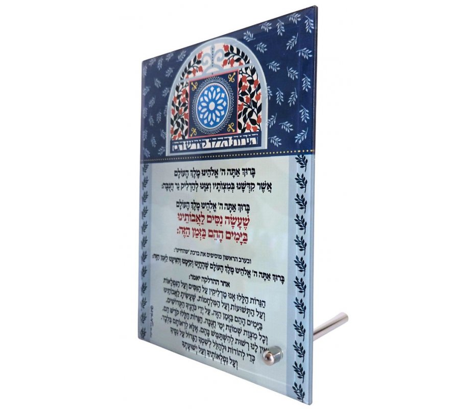 Enhance your holiday table with this elegant glass blessing stand from Dorit Judaica. Featuring a sweeping arc of pomegranates set against a deep blue background, the design blends rich color with traditional symbolism. The Menorah-lighting blessings are printed clearly on the glass, offering a convenient and beautiful way to follow the prayers.