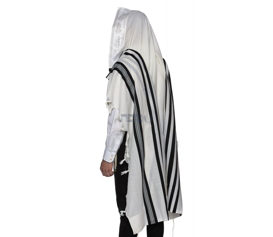 Product Description A white wool tallit with black stripes, featuring a textured non-slip weave for added stability during prayer. The inner stripes include a subtle black-and-white textured pattern, paired with a shiny white floral atarah for a refined finish.