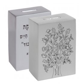 Charity Box with Cutout Pomegranates and "Tzedakah", Silver and White - Yair Emanuel$54.84 -