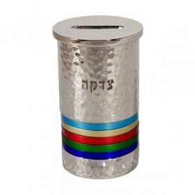 Silver Hammered Nickel Round Charity Box with Colorful Rings - Yair Emanuel$54.13 -