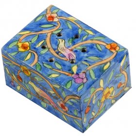 For those who appreciate fine ceramic, we recommend Michal Ben Yosef's Havdalah set featured in a choice of fine pastoral colors, standing on an attractive tray depicting a decorative design. Israeli artist Shraga Landesman offers a choice of sets - a delightful spring green color or an intriguing wood and metal set featuring a bird and pomegranate. The ever-popular Yair Emanuel strikes a cheerful note with his sleek Havdalah sets standing on colored trays. For the traveler, there is a striking wand set. If you are looking for an exclusive Havdalah set that is undoubtedly prestigious, indulge in the products of the maestro – Avner Agayof of Jerusalem. His Havdalah sets display the sleek geometric style for which he is famous… angular candle holders, circular spice holders with etched text and elegant pillar-shaped cups. As you scroll through the collection, you will notice the option for purchasing separate individual spice holders or other items.