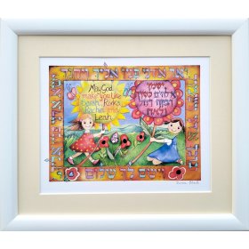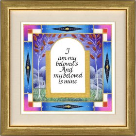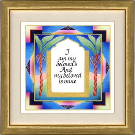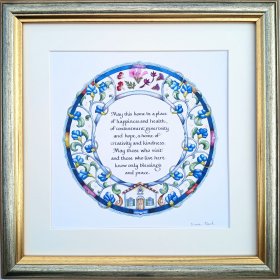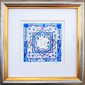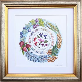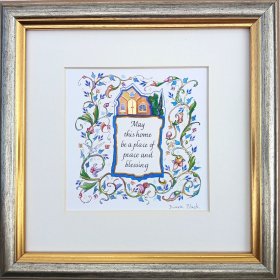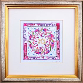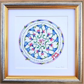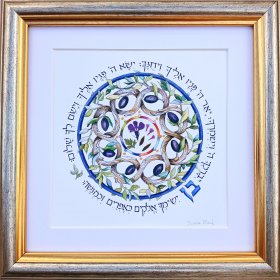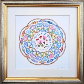 This incredibly gifted artist hails from South Africa where she studied and taught art and music. After her marriage, she made Aliya and settled in a small picturesque moshav in the Judean Hills. There, surrounded by the magnificent sweeping landscape of Israel, she found expression for her prodigious artistic talents. Fulfilling a life-dream, she set up her own studio and began to produce handmade illuminated and illustrated Judaica wall hangings that combined her passion for ancient Hebrew texts and words of blessing with the inspiration she derived from the flowers and greenery viewed from her studio window.