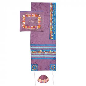 Mauve Polysilk Tallit Set Colorful Embroidered Jerusalem Design - Yair Emanuel16" x 70"$135.42 -