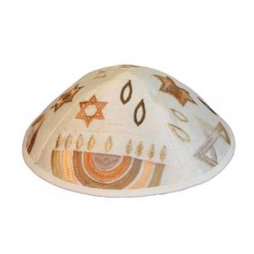 Embroidered Kippah with Hanukkiah, Star of David and Flame in Gold - Yair Emanuel$15.23 -