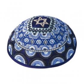 Embroidered Kippah with Large Star of David and Circular Bands, Blue - Yair Emanuel$13.00 -