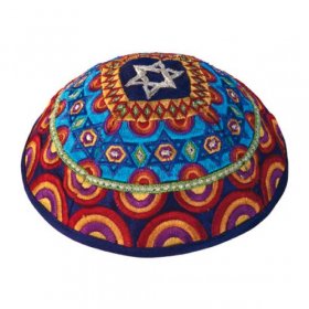 Embroidered Kippah with Stars of David in Blue and Red - Yair Emanuel$13.00 -