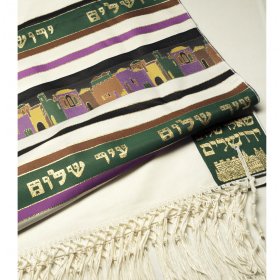 In contrast to the strictly classic white with black stripes design, you will also find a selection of decorative prayer shawls – adding a touch of color and individuality. Consider the choice of stripe designs, reminiscent of Joseph’s coat of many colors. Or, enjoy the tallit displaying images of Jerusalem or the Seven Fruits. There are also tallitot for different groups – a Tallit for Yemenite, a Turkish Tallit for Hassidim and a Chabad Tallit with its distinctive knotting sequence.