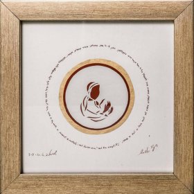 She works in various mediums - painting, drawing and sketching and her favorite -intricate paper cutting combined with micrographics. With intense concentration, she works patiently for hours with her small knife and pen, cutting and writing and adding paint highlights. The result is an exquisite harmony of picture and text.