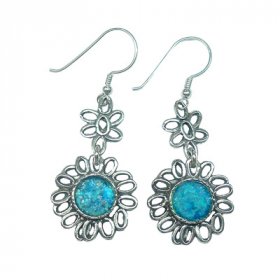 Sterling Silver Dangle Earrings with Roman Glass Set in Flower Frame - Michal Kirat$102.97 -