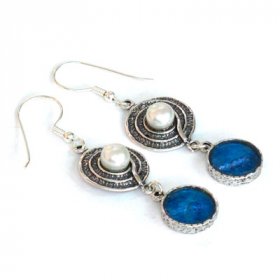Sterling Silver Dangle Roman Glass Earrings with Pearl on Circular Disc - Michal Kirat$162.28 -